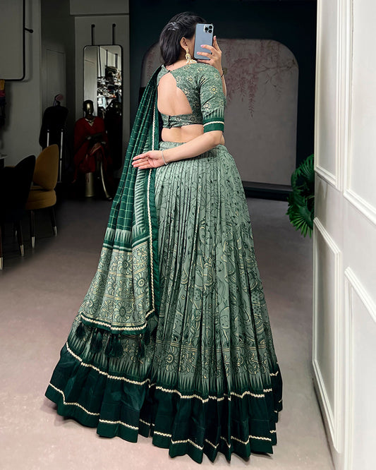 Green Color Tasar Silk Kalamkari Printed Lehenga Choli