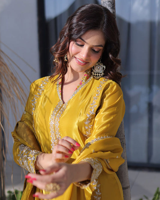 Yellow Color Ho Silk Embroidered Kurti Suit