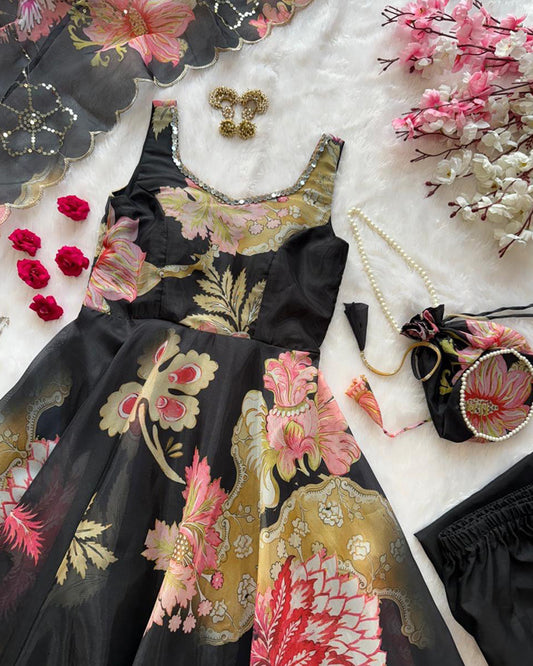 Black Color Digital Printed Soft Organza Anarkali Suit