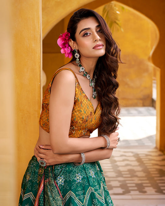 Bottle Green Color Vichitra Silk Printed And Embroidered Lehenga Choli