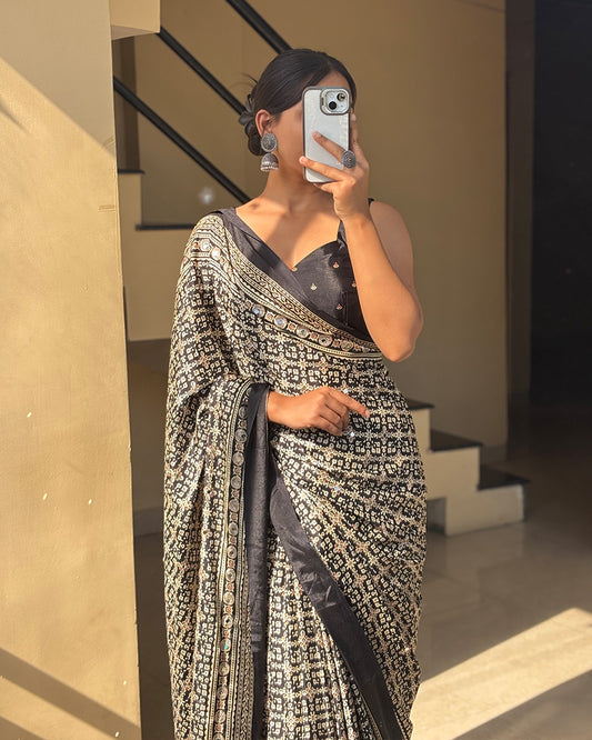 Black Color Pure Crape Silk Ajarakh Print Saree