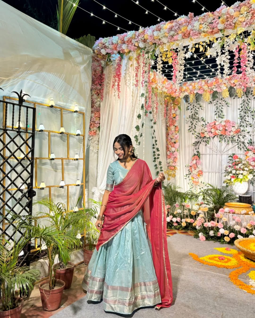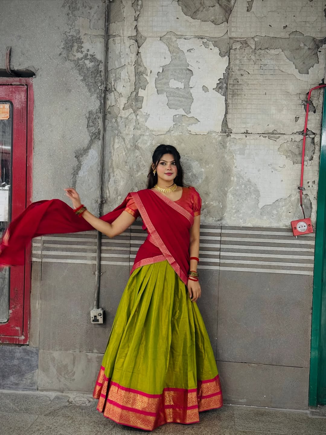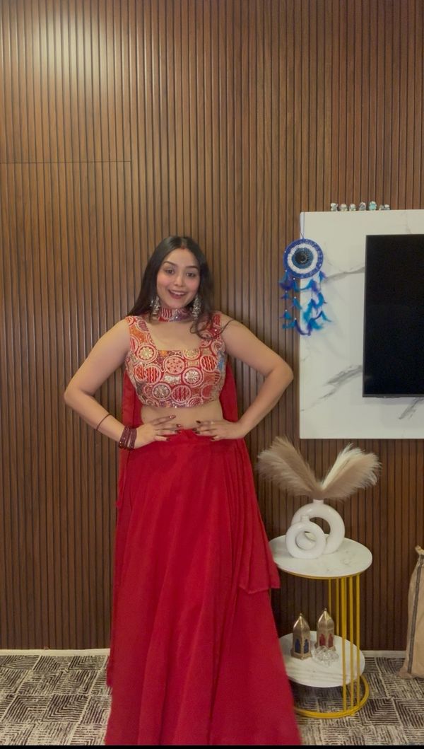 This red lehenga is honestly such a budget-friendly steal. The fabric feels lightweight and comfortable, perfect for long functions without feeling heavy. The blouse has clean embroidery, sits well on the body and the fit is true to size