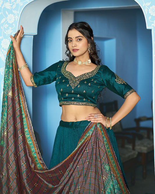 Elegant Teal Green Embroidered Vichitra Silk Lehenga Choli