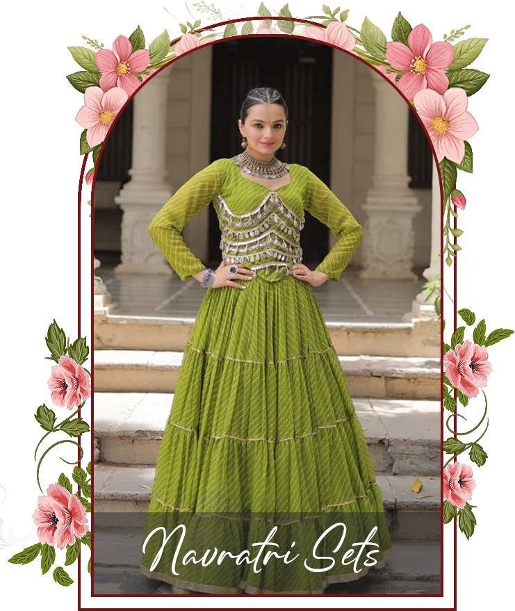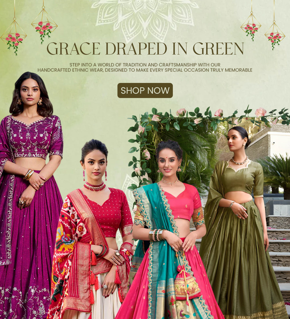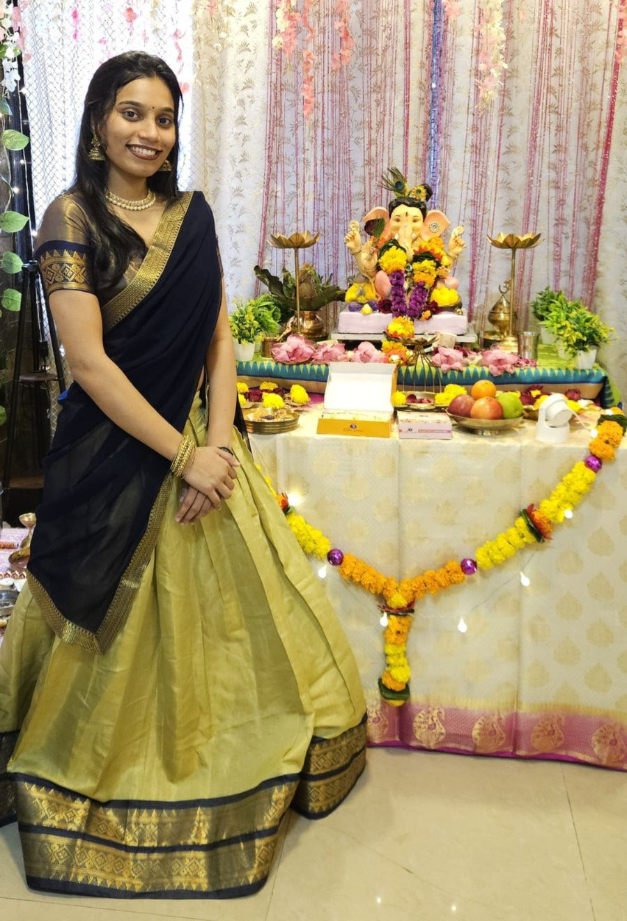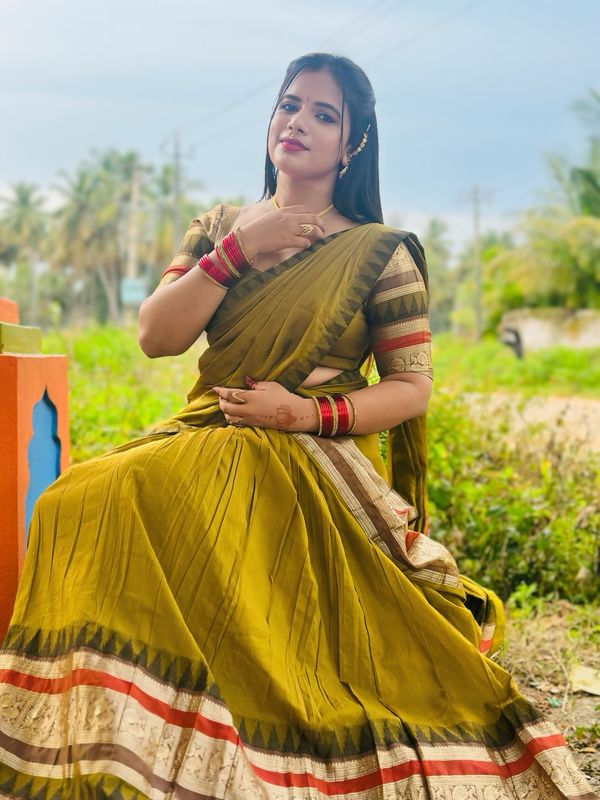 This half saree is a perfect blend of tradition and elegance. The rich contrast of deep navy/black with olive green, highlighted by a classic gold zari border, gives it a timeless and graceful appeal.