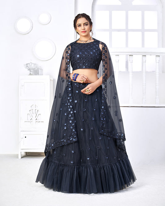 New Design Blue Color Net Frill Semi Stitched Lehenga Choli