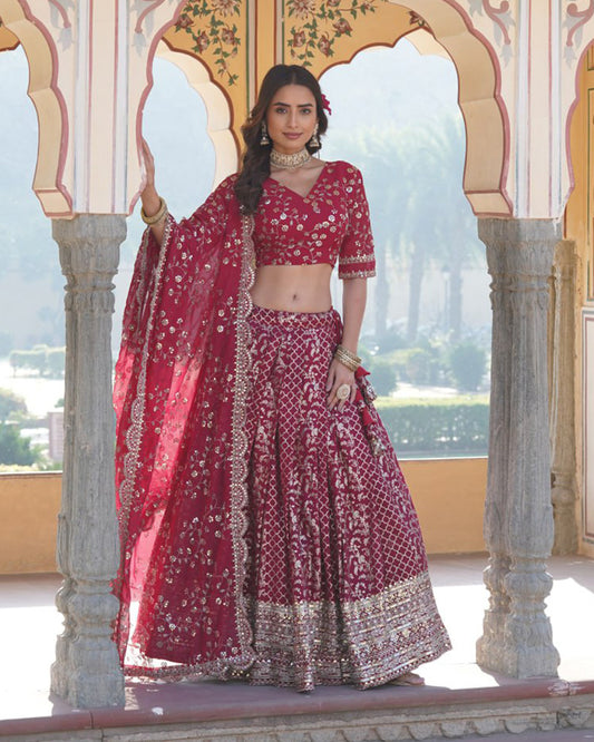 New Design Wine Color Sequence Embroidered Jacquard Lehenga Choli