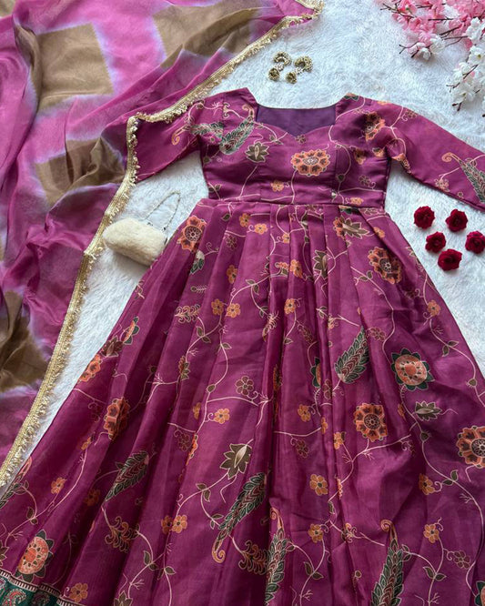 Onion Pink Color Floral Pure Soft Tebby Organza Three Piece Anarkali Suit