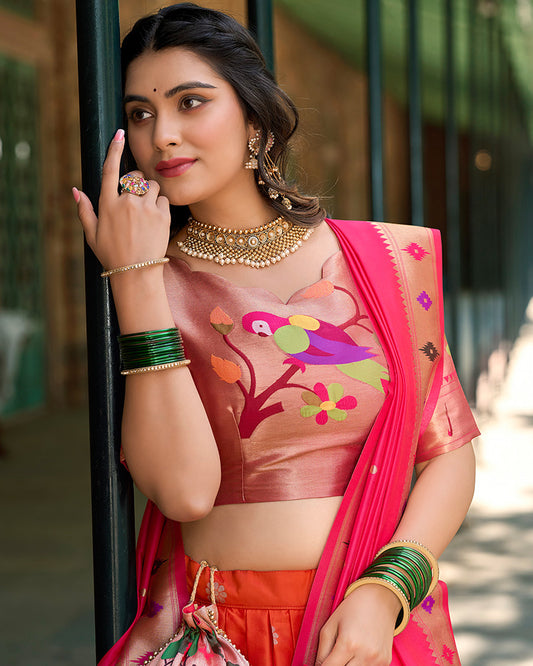Orange Color Jacquard Silk Zari Weaving Work Lehenga Choli