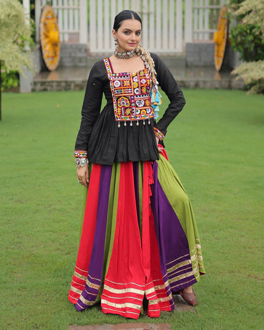 Parrot Green And Black Color Pure Cotton Navratri Lehenga Choli