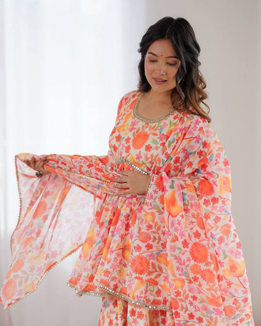 Orange Color Flower Print Tabby Organza Anarkali Suit