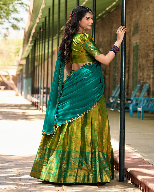 Parrot Green Color Poly Cotton Zari Weaving Lehenga Choli