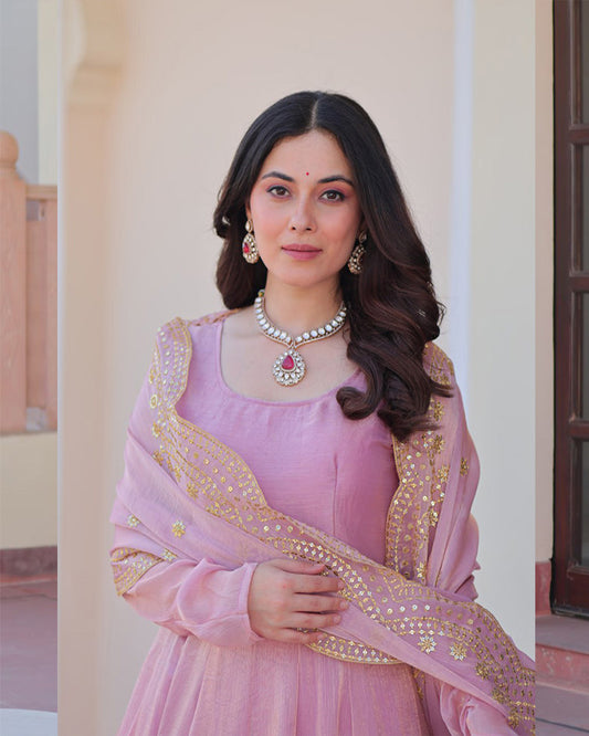 Peach Color Chinon Silk Sequins Embroidered Gown