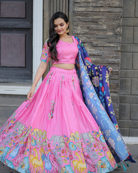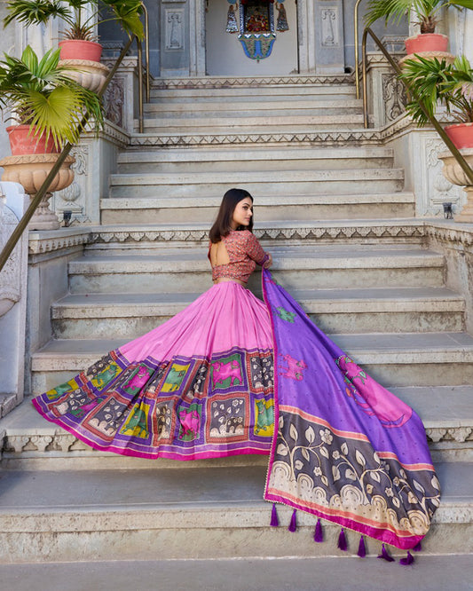 Peach Color Tussar Silk Kalamkari Printed Lehenga Choli