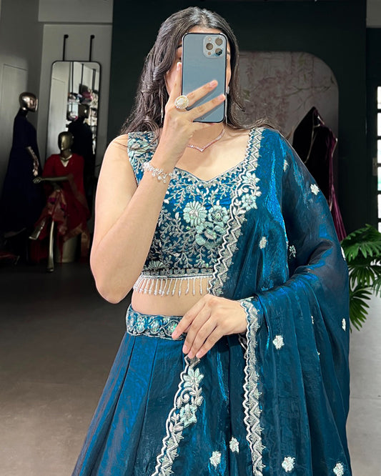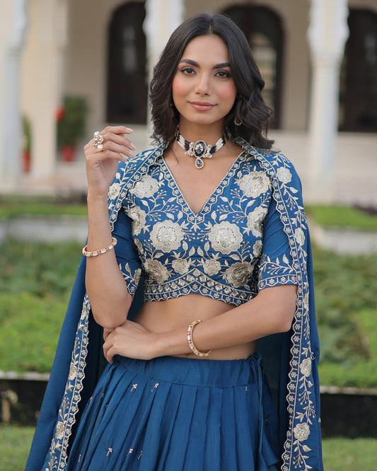 Peacock Blue Color Vichitra Silk Thread Embroidered Lehenga Choli