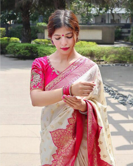 Pink And Cream Color Banarasi Jacquard Soft Silk Saree