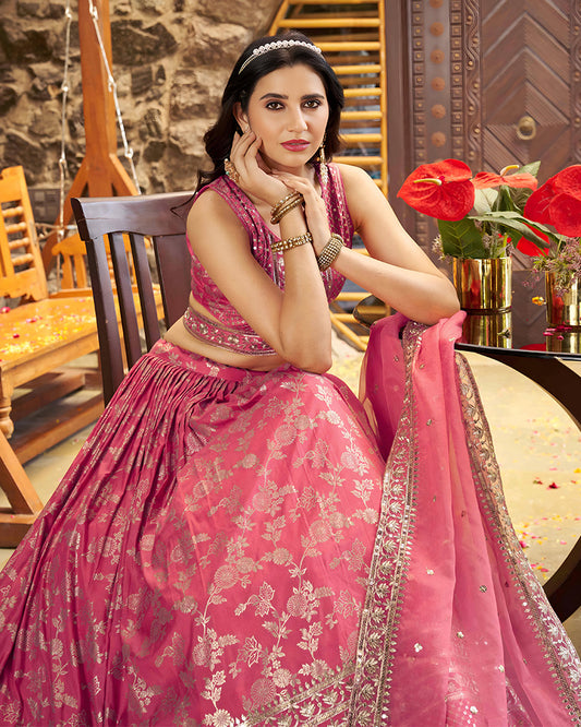 Pink And Off-White Color Embroidered Jacquard Lehenga Choli