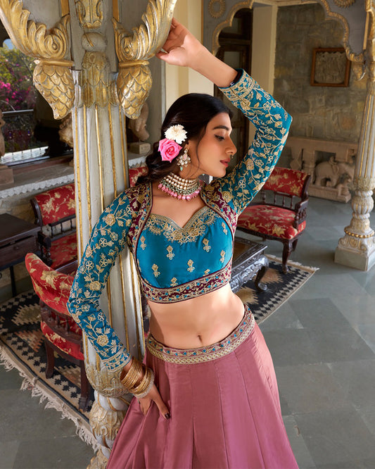 Peach And Rama Color Embroidered Mulberry Silk Lehenga Choli