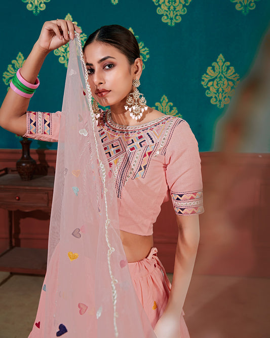 Peach Pink Color Weone Silk Embroidered Lehenga Choli