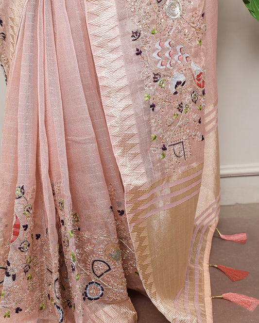 Peach Color Embroidered Kota Tissue Saree