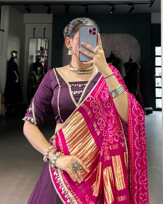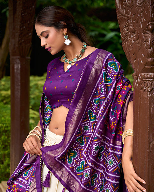 Purple Color Tussar Silk Bandhej And Patola Printed Navratri Lehenga Choli