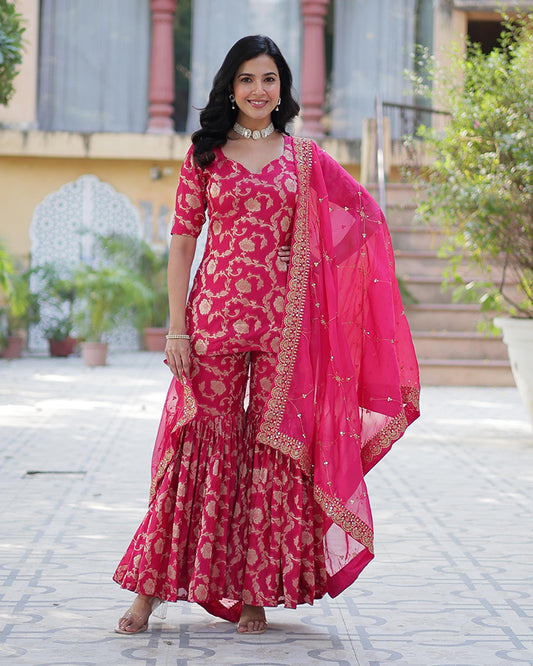 Rani Pink Color Gaji Silk Three Piece Sharara Suit
