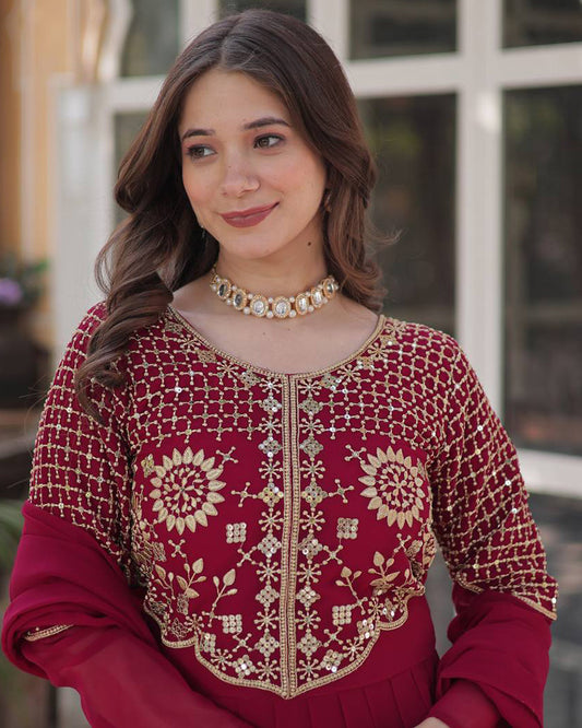 Rani Pink Color Faux Blooming Georgette Gown With Embroidered Dupatta