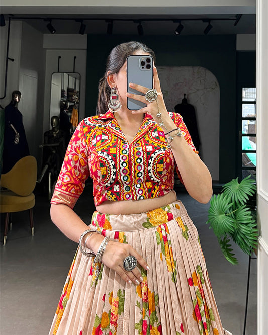 Red Color Tussar Silk Floral And Foil Printed Navratri Lehenga Choli