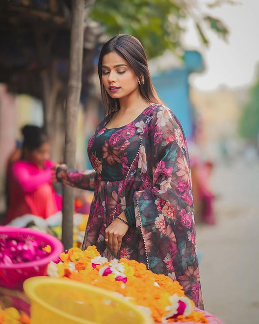 Rugee In Our Floral Print Organza Black Color Three Piece Anarkali Suit