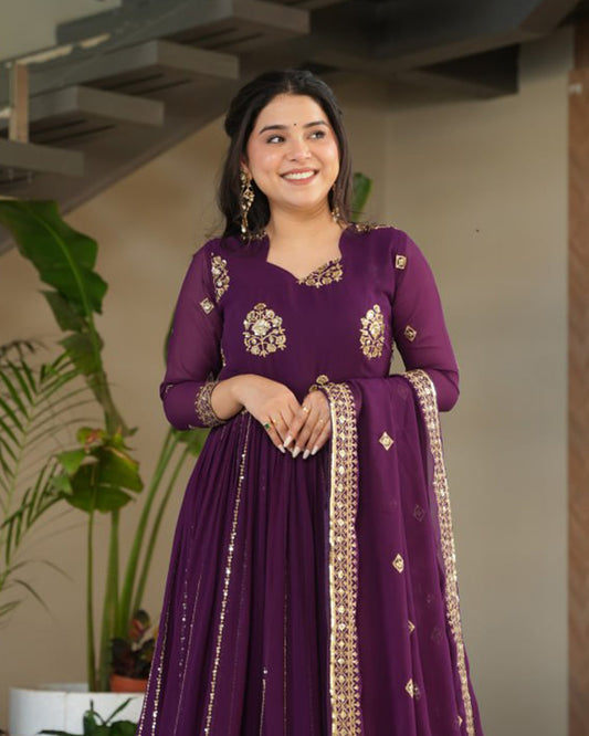 Royal Maroon Color Faux Blooming Zari Embroidered Work Gown