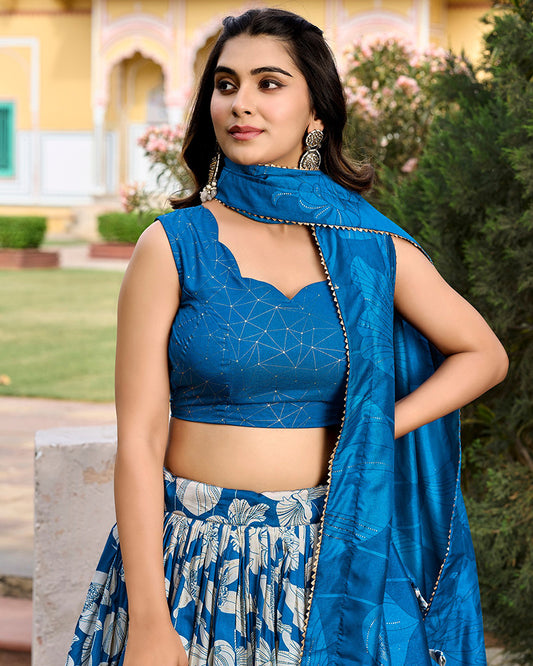 Royal Blue Color Tussar Silk Floral And Foil Printed Navratri Lehenga Choli