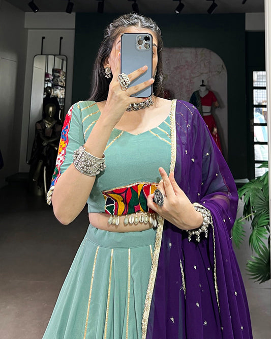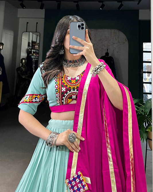 Sea Green Color Rayon Embossed Navratri Lehenga Choli