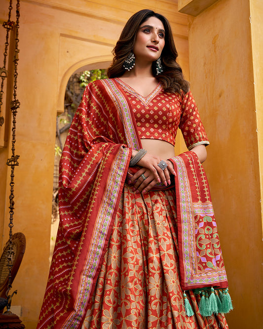 Rust Orange Color Dola Silk Batik Printed Lehenga Choli