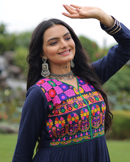 Traditional Navy Blue Kutchi Embroidered Navratri Gown