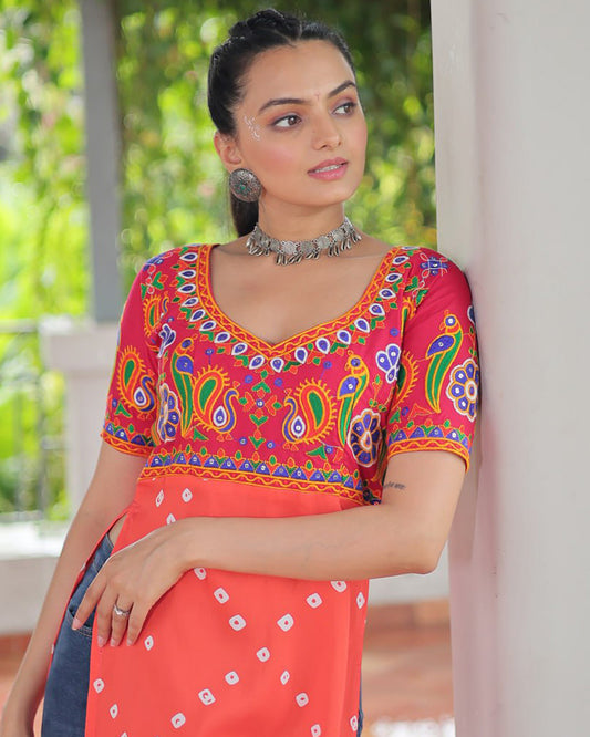Traditional Orange Pink Color Bandhani Print Navratri Kurti