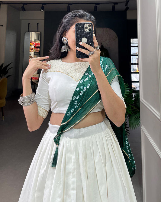 White Color Kora Cotton Lehenga With Parrot Green Choli