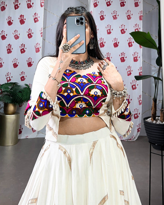 White Color Georgette Paper Mirror Work Lehenga Choli