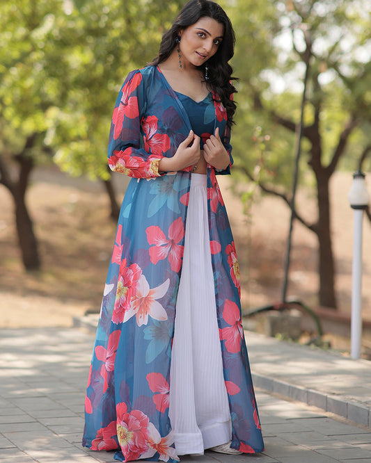 White Color All Over Floral Printed Chiffon Gown
