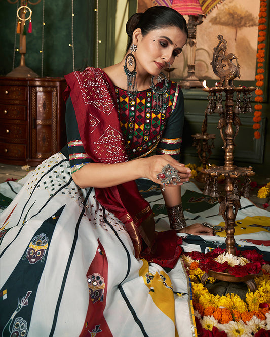 White Color Maslin Cotton Printed Mirror Work Navratri Lehenga Choli