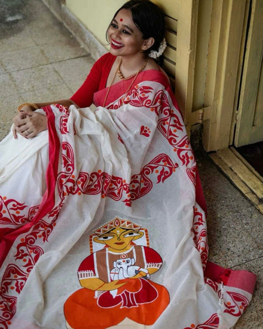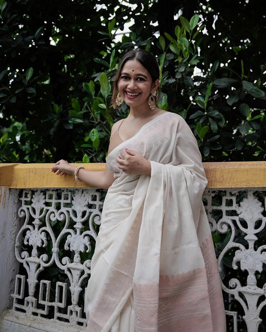 White Color Linen Printed Saree