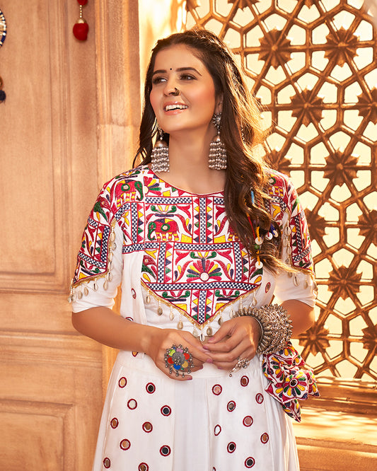 White Color Rayon Kutchi Gamthi Style Navratri Gown