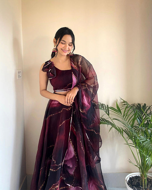 Wine Color Pure Organza Full Stitched Lehenga Choli