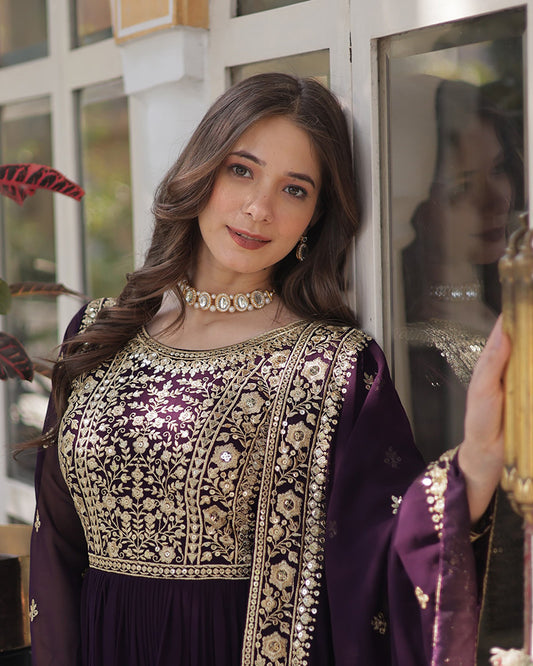 Wine Color Faux Blooming Embroidered Gown With Dupatta