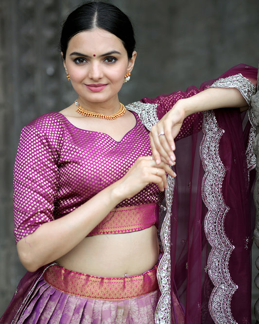 Wine Color Kanjivaram Pattu Silk Designer Half Saree