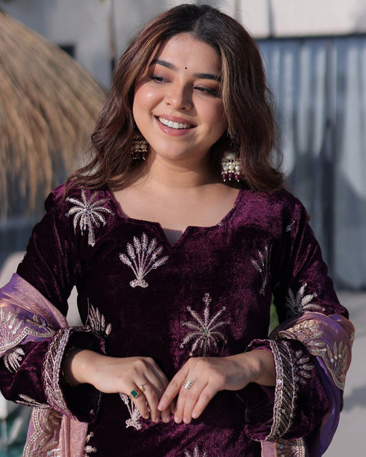 Wine Color Ice Velvet Embroidered Plazzo Suit