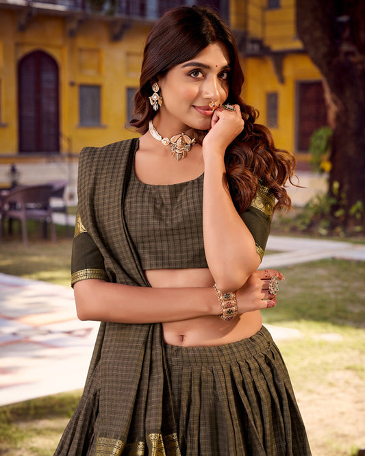 Elegant Parrot Green Chanderi cotton half saree lehenga choli