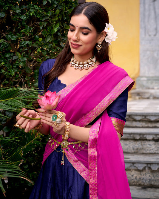 Elegant Navy Blue Chanderi Cotton half saree lehenga choli