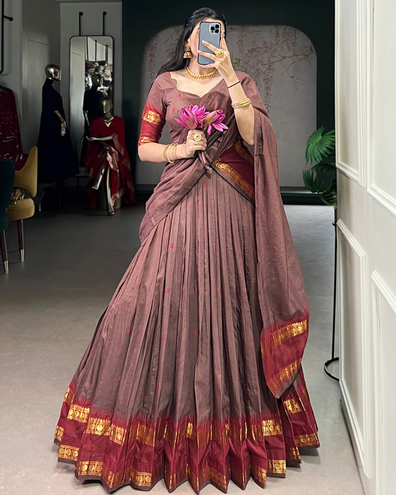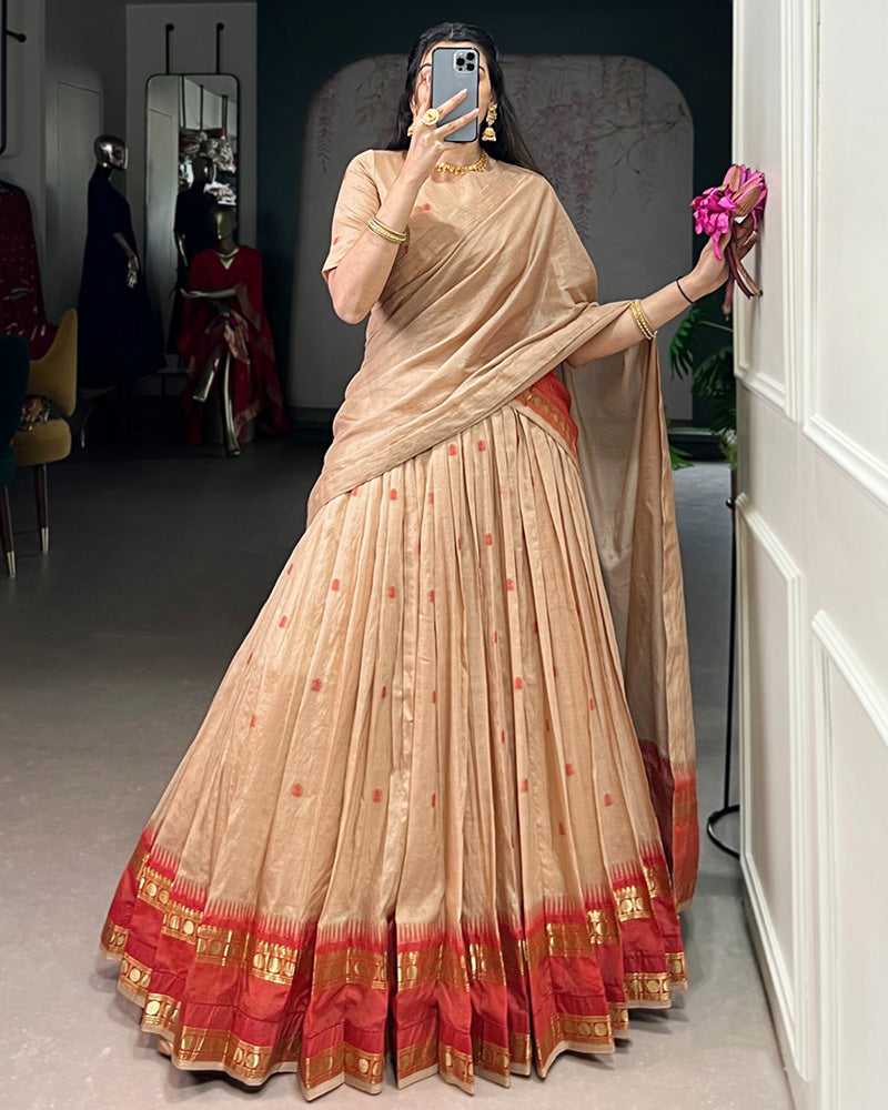 Radiate sophistication in this elegant teal green pure Chanderi half saree, adorned with intricate zari weaving. Paired with an unstitched blouse, it’s perfect for festive occasions, weddings, and traditional celebrations.