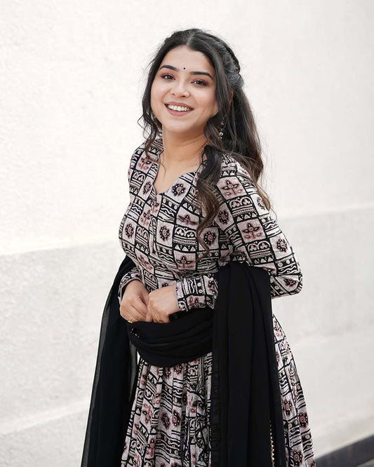Black Color Laheriya Printed Pure Cotton Anarkali Suit