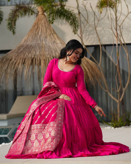 Rani Pink Color Chanderi Pure Roman Silk Anarkali Suit
