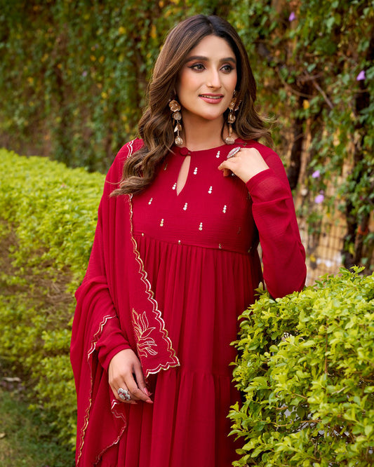 Maroon Color Roman Shimmer Chanderi Silk Three Piece Anarkali Suit